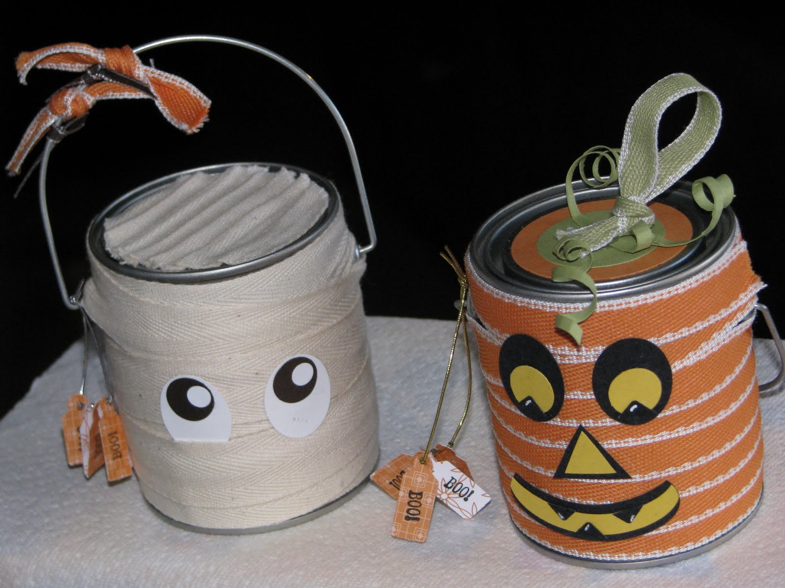 Now I know I seen the little mummy can somewhere I just cant remember where, so I hope I did a good job re-creating it. Once I finished the mummy can I wondered what else can I create in the same fashion and I think the Stampin up peach in-color ribbon did just the job for the pumpkin; I'm not quite happy with his face but he still turned out o.k.. Taylor's teachers will be receiving those.
